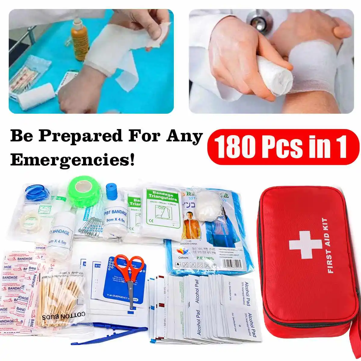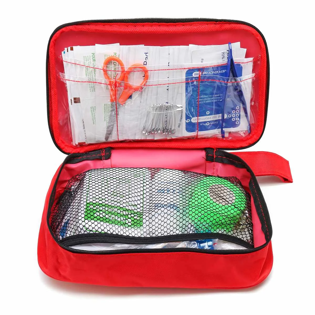 | 1 x Red First Aid Bag 1 x Scissors(9cm) 1 x Plastic Tweezers 1 x PBT Elastic Bandage(4.5cm*5m) 1 x PBT Elastic Bandage(4.5cm*7.5m) 54 x Adhesive Stypsis Bandages 30 x Alcohol Pad 4 x Soap Wipe 4 x Sting Relief 4 x Antiseptic Cleansing Wipe 1 x Sterile Gauze Swab(7.5*7.5cm) 1 x Sterile Gauze Swab(5*5cm) 1 x Adhesive Wound Dressing(6*7cm) 1 x Adhesive Wound Dressing(6*10cm) 1 x Adhesive Bandage 2 x Bandage Triangulaire(96cm*96cm*136cm) 1 x Disposable PVC Gloves(1 Pair) 10 x Safety Pins 1 x Cotton Buds 1 x Emergency Blanket(130*210cm) 1 x Burn Dressing(40*60cm) 1 x Rainwear 1 x Versatile Bandages 1 x Green Bandage 1 x Mouth to Mouth Resuscitation Device |